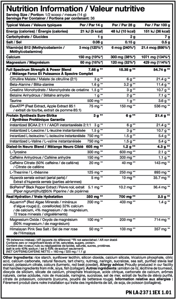 • Dialed-In Neuro Blend: Potenta doser av L-Tyrosin, koffein (anhydrous & citrate), L-Theanin, Huperzine A och BioPerine® för mental skärpa och fokus