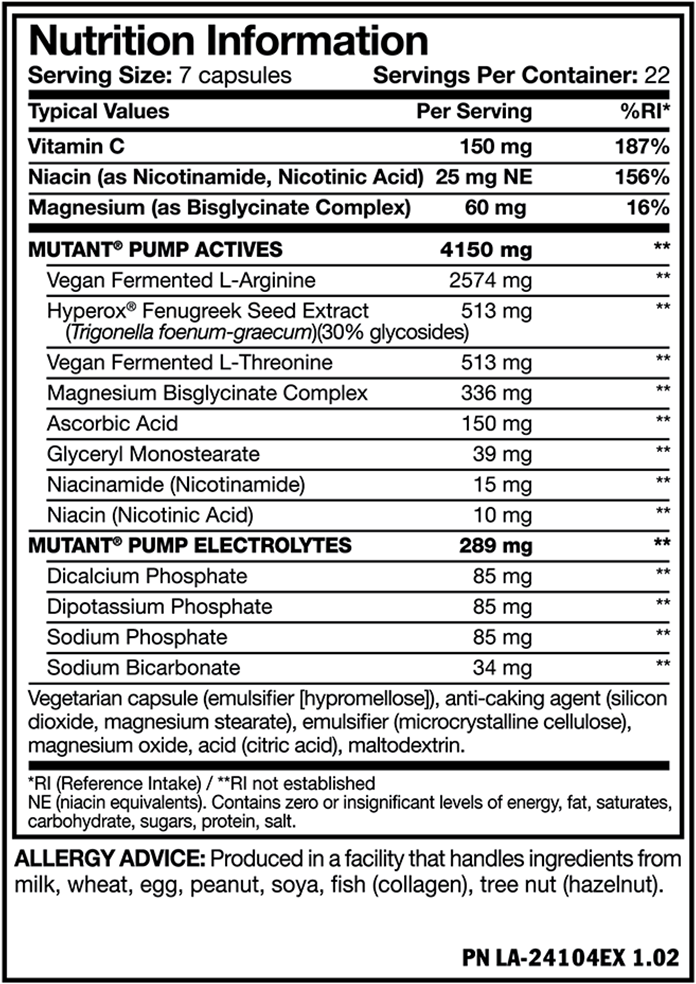 Mutant Pump är sammansatt med noggrant utvalda ingredienser i rätt doser för maximal effekt. Den innehåller över 4 g aktiva ämnen per portion, inklusive (veganskt fermenterad) L-Arginin, Hyperox® fenugreekfröextrakt, (veganskt fermenterad) L-Treonin och magnesium.