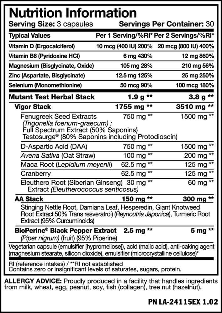 Formulan är berikad med viktiga vitaminer och mineraler som B6, D, magnesium, zink, selen och BioPerine® för optimal upptagning och stöd. Mutant Test är ett effektivt tillskott för dig som vill öka testosteronnivåerna och förbättra din träningsprestation.