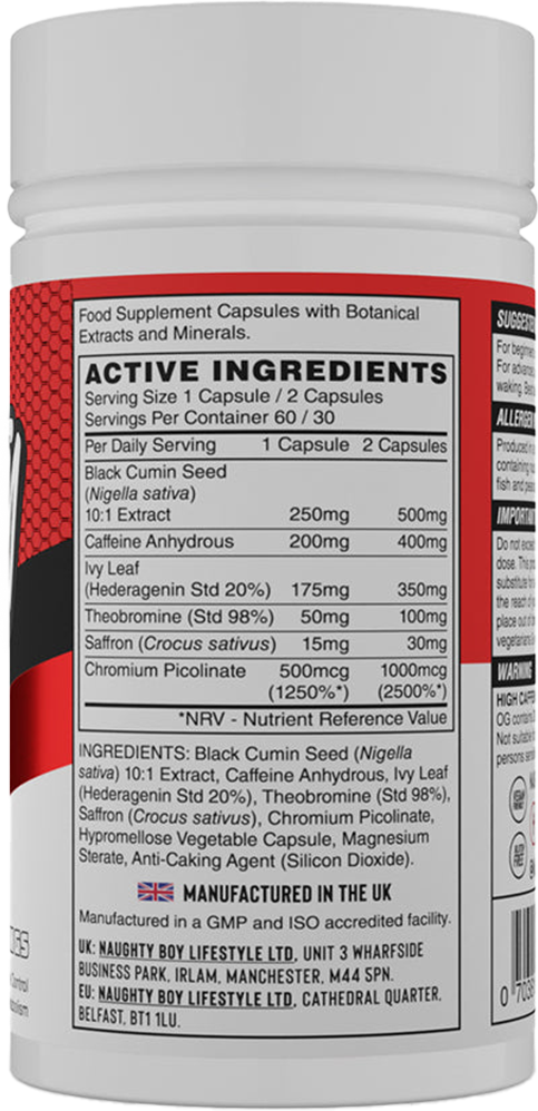 Naughty Boy Shred OG är långt mer än ett vanligt viktkontrolltillskott. Denna avancerade formula kombinerar klassiska ingredienser som koffein, murgröna och krompikolinat med traditionellt uppskattade ämnen som Nigella Sativa (svartkummin) och saffran.