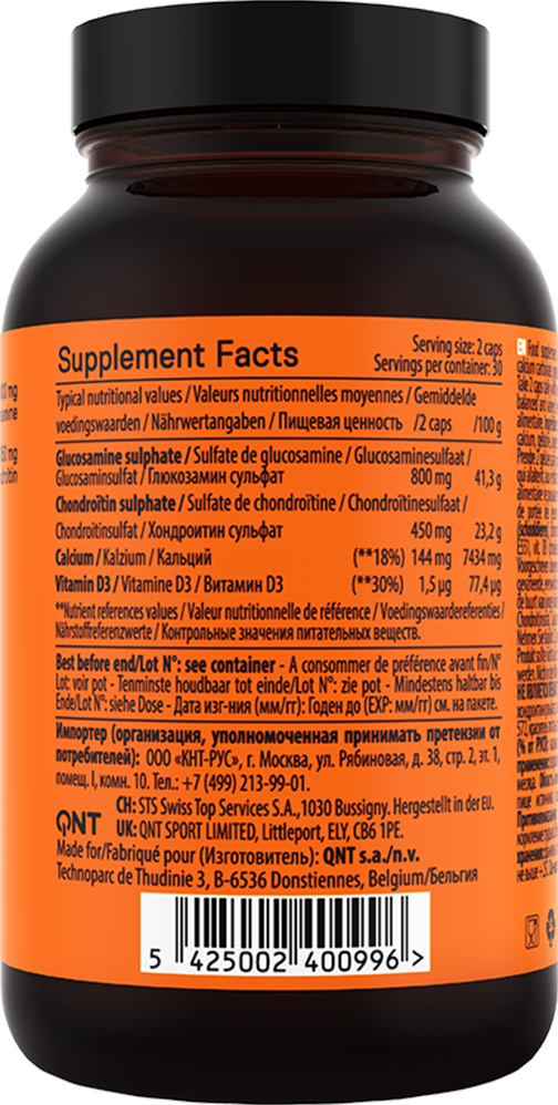 Glukosamin är en substans som kroppen normalt tillverkar själv från glukos och glutamin, men behovet kan öka vid intensiv fysisk belastning eller med stigande ålder. Kondroitin är en naturlig komponent i broskvävnad som hjälper till att bevara ledernas struktur och funktion. För att ytterligare stärka skelettet innehåller formulan vitamin D, som bidrar till att upprätthålla normal benstomme och stödjer kalciummetabolismen.