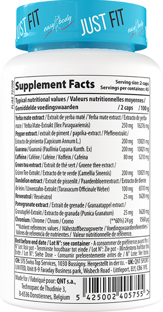 Yerba mate-extrakt (250 mg per 2 kapslar) – känt för sina antioxiderande egenskaper och stödjande effekt på ämnesomsättningen.
