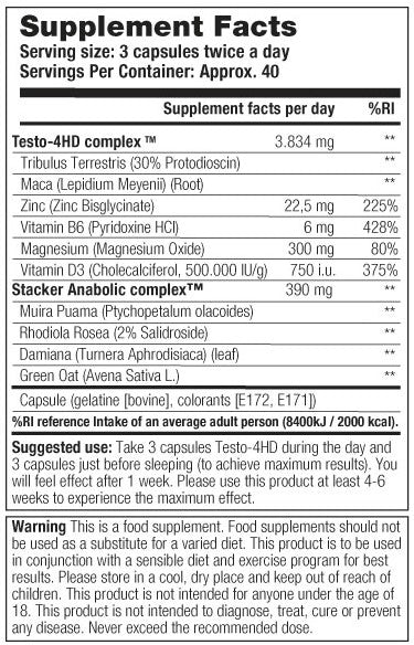 Stacker2 Testo 4HD är ett kraftfullt kosttillskott för dig som vill maximera din prestation, återhämtning och vitalitet – både i och utanför gymmet. Den avancerade formulan kombinerar viktiga vitaminer och mineraler med välbeprövade växtextrakt för att stödja hormonell balans och fysisk kapacitet.
