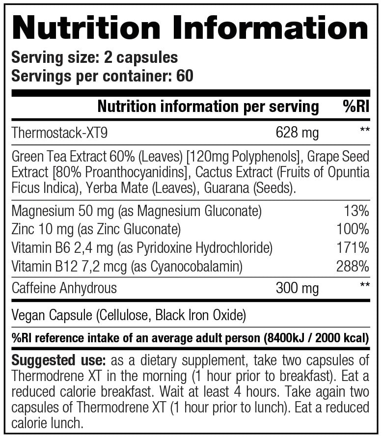 Stacker2 Thermodrene XT är ett avancerat fettförbränningskomplement utvecklat för dig som är fokuserad på din fysik och dina deffmål. Formulan är framtagen i samarbete med erfarna atleter och innehåller hela 300 mg koffein per portion, kombinerat med 628 mg av Thermostack-XT9-blandningen – en mix av bland annat grönt te, vindruvskärnextrakt, kaktusextrakt, yerba mate och guarana. Tillskottet innehåller även zink, som bidrar till normal ämnesomsättning, samt vitaminerna B6 och B12, som motverkar trötthet och stödjer energinivåerna. Thermodrene XT är en perfekt partner för din deffperiod och målinriktade träningsrutin.