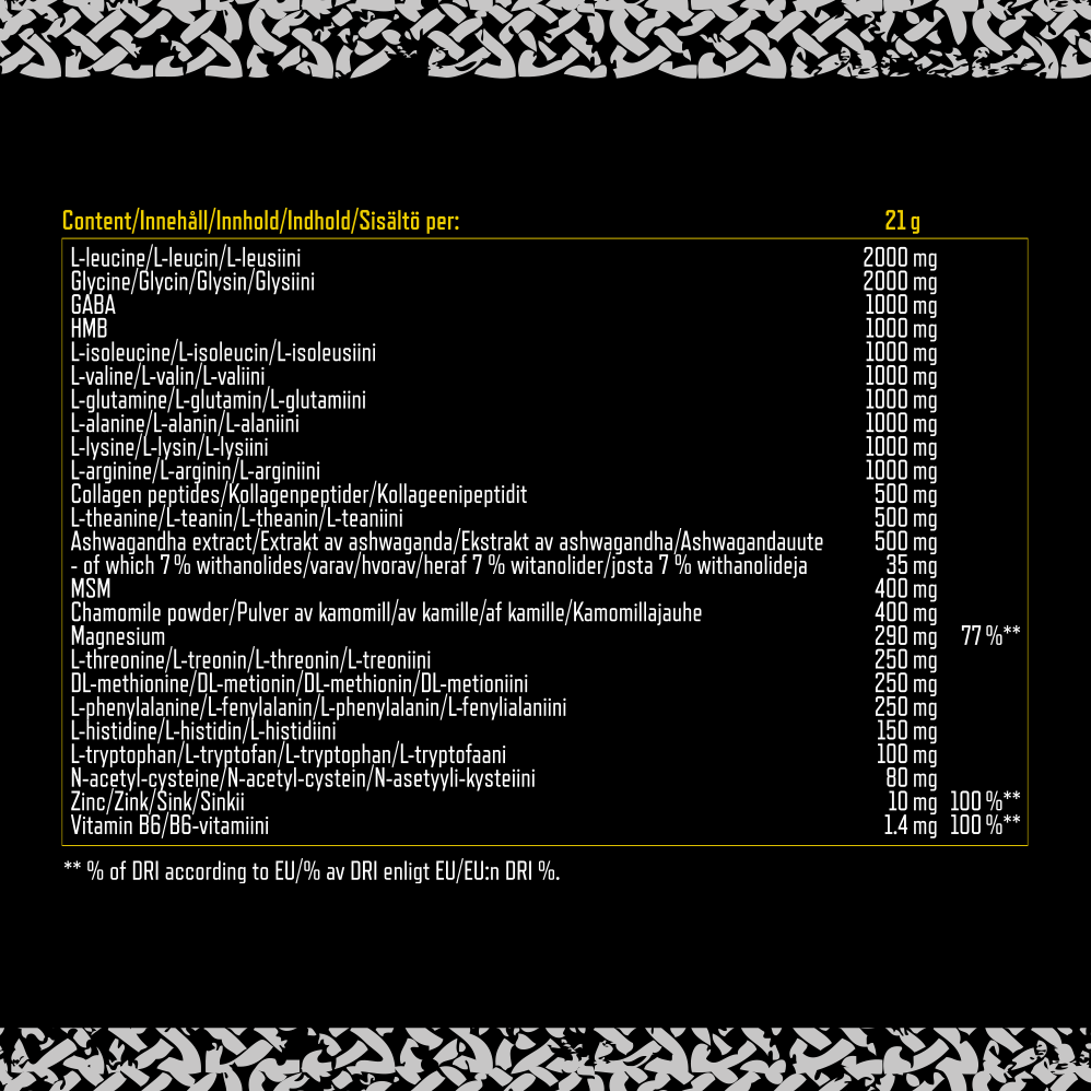 Viking Power Ymir Sleep & Grow är en avancerad återhämtnings- och sömnformula utformad för att stödja både djup sömn och effektiv muskelåterhämtning. Varje portion innehåller en kraftfull kombination av EAAs, BCAAs, GABA, ashwagandha, kamomill, samt viktiga vitaminer och mineraler.